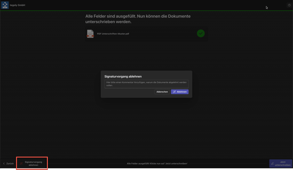 Am Ende des Signaturvorgang kann der Unterzeichner die Unterschrift der Dokumente ablehnen. In dem Fenster kann ein Kommentar eingegeben werden.