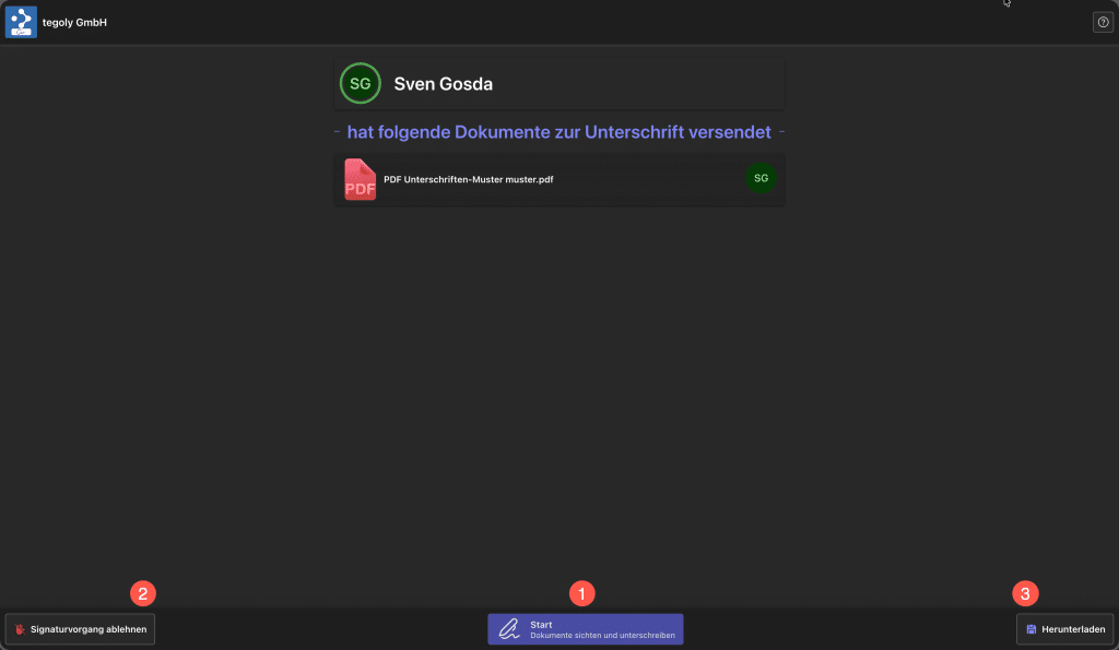 Go to Start and the document will be previewed. There is also the option to reject the signature process 2 and the documents can also be downloaded 3.
