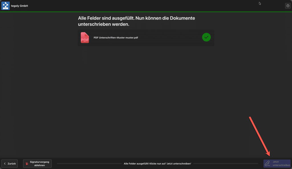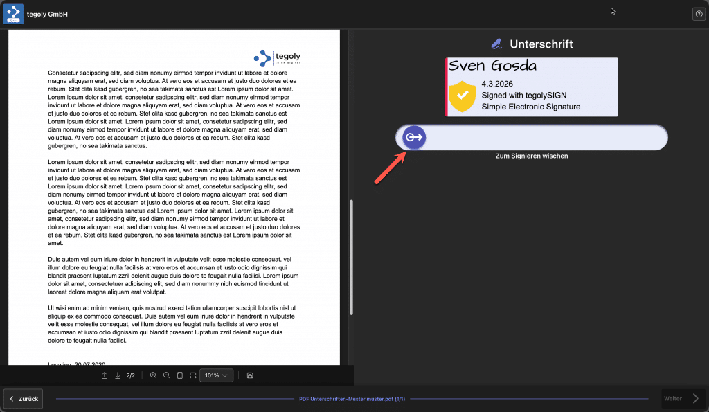The “Swipe to sign” slider confirms the signature. Optionally, it may be necessary to enter a handwritten signature (see video). If there are several fields to fill in or signatures to be made, the software automatically jumps on.