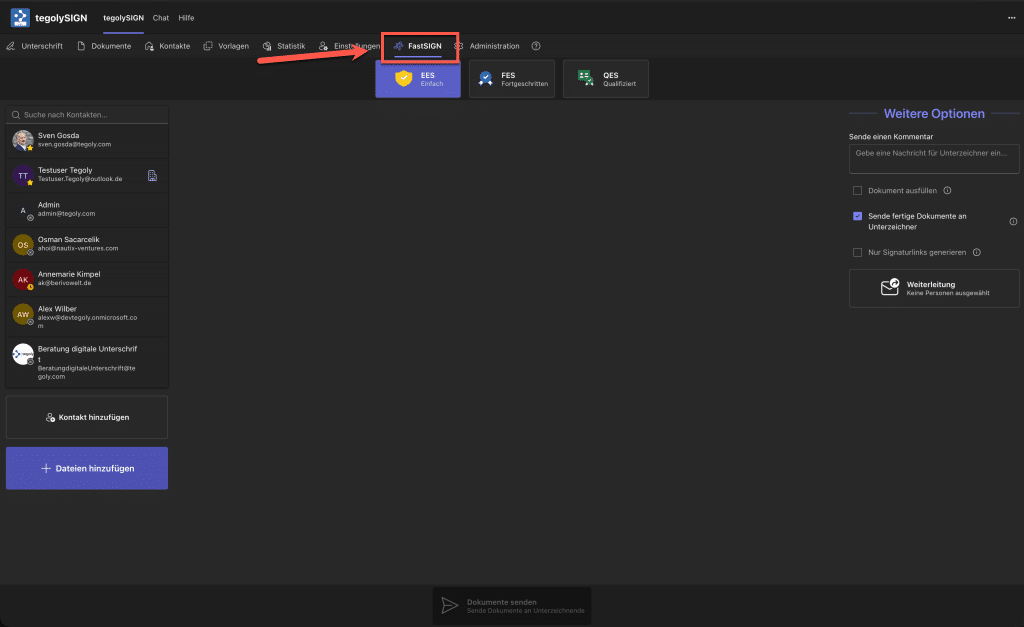 Mit FastSIGN wird die Bearbeitung von Signaturvorgängen wesentlich schneller, da dass setzen der Unetrschriftsfelder, einer Reihenfolge und Frist wegfällt. Somit ermöglicht FastSIGN eine schnelle und einfach Erstellung und Versendung der Vorgänge.