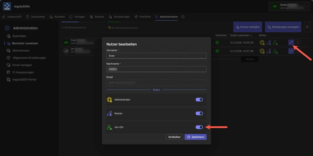 Anschließend kannst du dem Nutzer die Rolle Vor-Ort zuweisen.